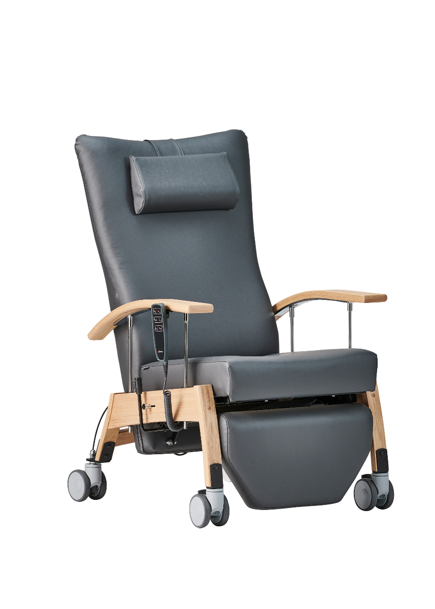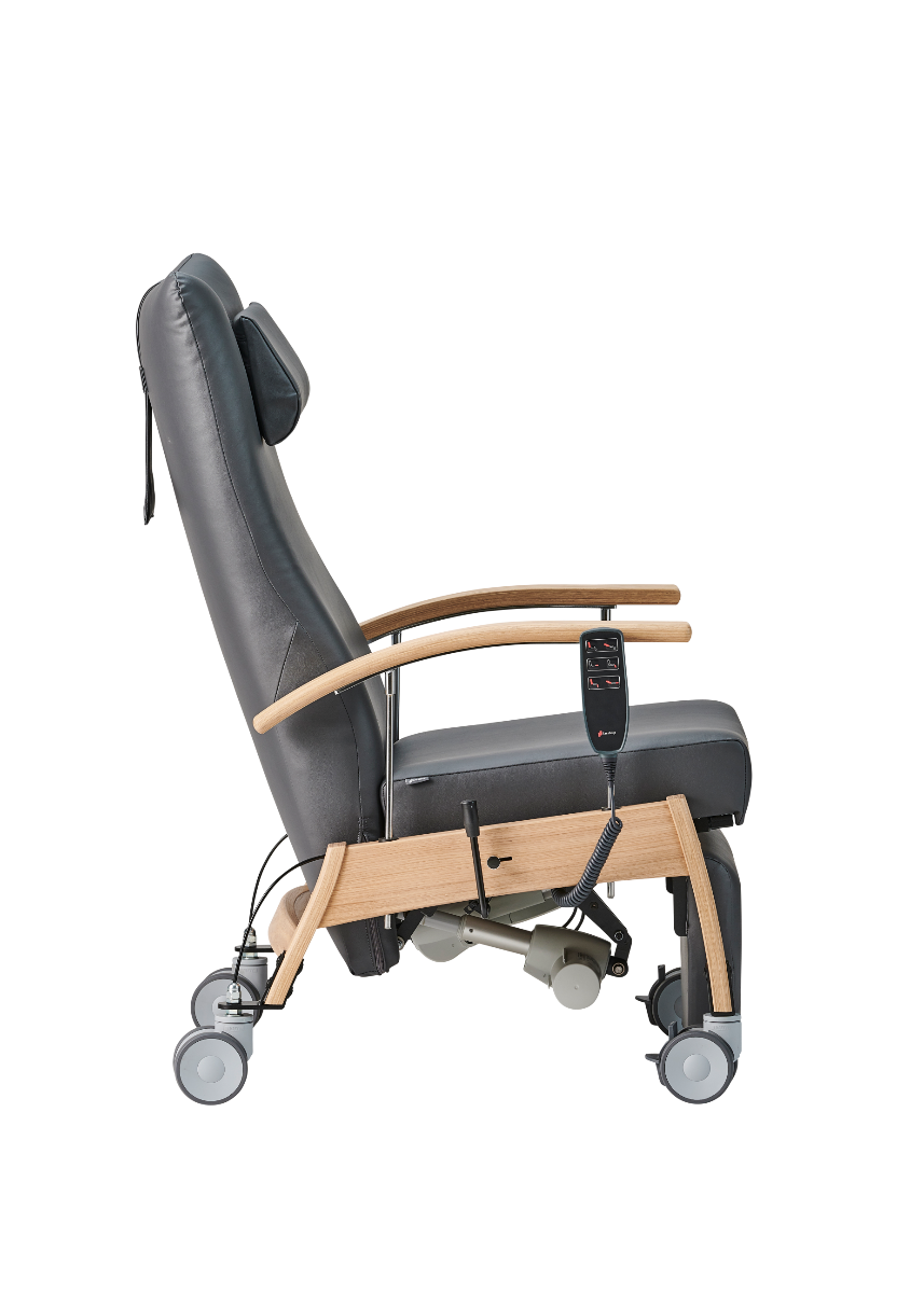 6341 is a multifunctional chair with built-in footrest, adjustable armrests and continuously adjustable back, which is available with wheels, motors, rechargeable battery etc.. Here it is shown with selected functions that are not standard