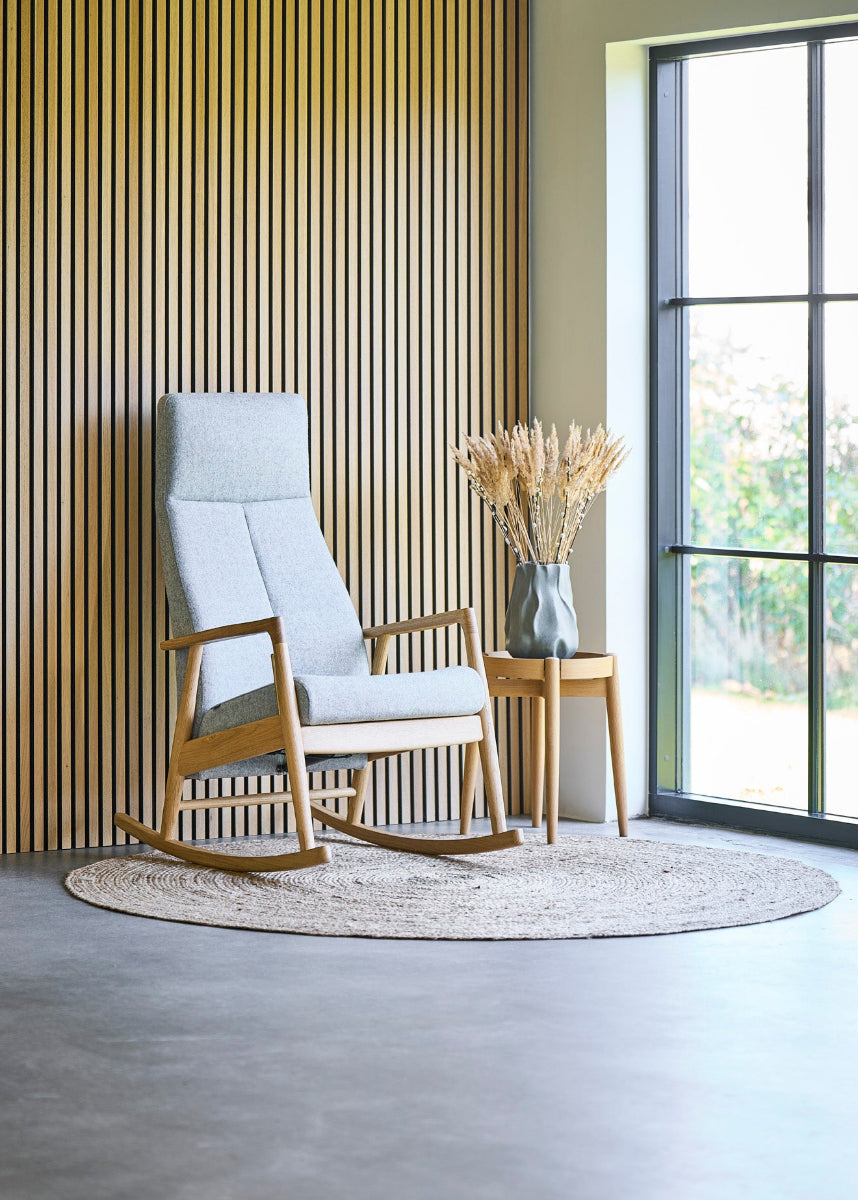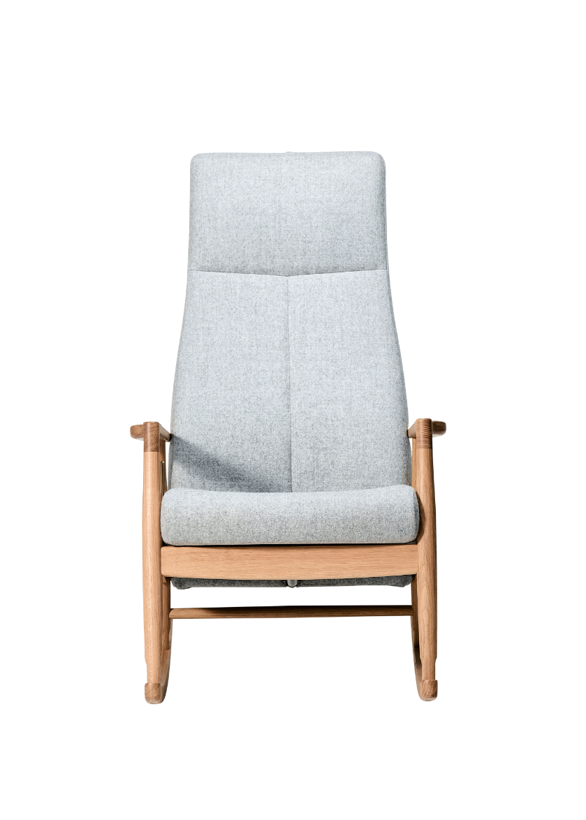 The rocking chair's frame is made of solid oak - where it is possible to choose between several different surface treatments (see specifications) and it is possible to choose between a wide selection of quality textiles, leather and artificial leather in a myriad of different colors.
