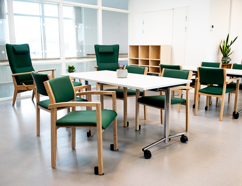 The dining area is furnished with Scala 2411 – Scala is a stackable chair with high seating comfort. The 2411 model is with armrests (also available with grab bars – Scala 2419 and without armrests – Scala 2410 ). For this care center, it is fitted with sliding wheels - to be able to easily push the chair in and pull it out.